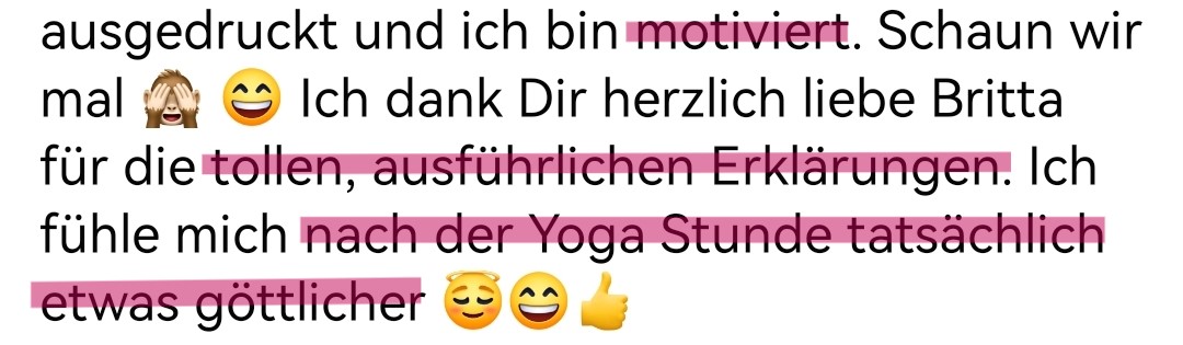 Du setzt dich auf deine Matte, und ich bin wirklich da – als echte Britta, die dich anfeuert, mitlacht und dir zeigt, dass du genau so richtig bist, wie du bist.