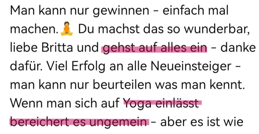 Ich empfehle jedem den Kurs zu machen, der Yoga lernen will! Britta, Du bist die beste Yogalehrerin, weil du deine Begeisterung für dieses Lebensgefühl mit uns teilst – vielen Dank dafür!